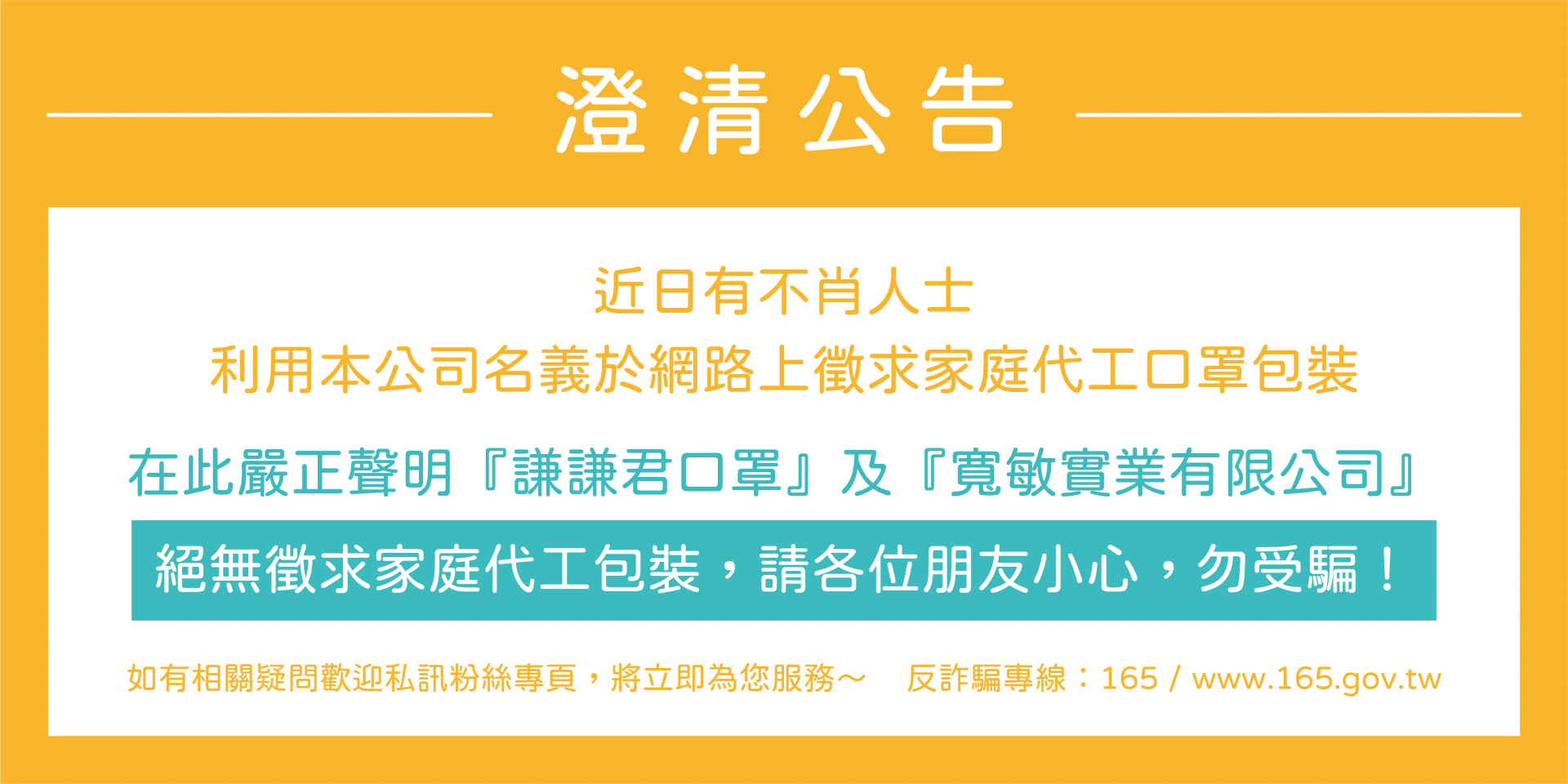 在此嚴正聲明「謙謙君口罩」以及「寬敏實業有限公司」都絕無徵求家庭代工包裝,請各位朋友小心,勿受騙!