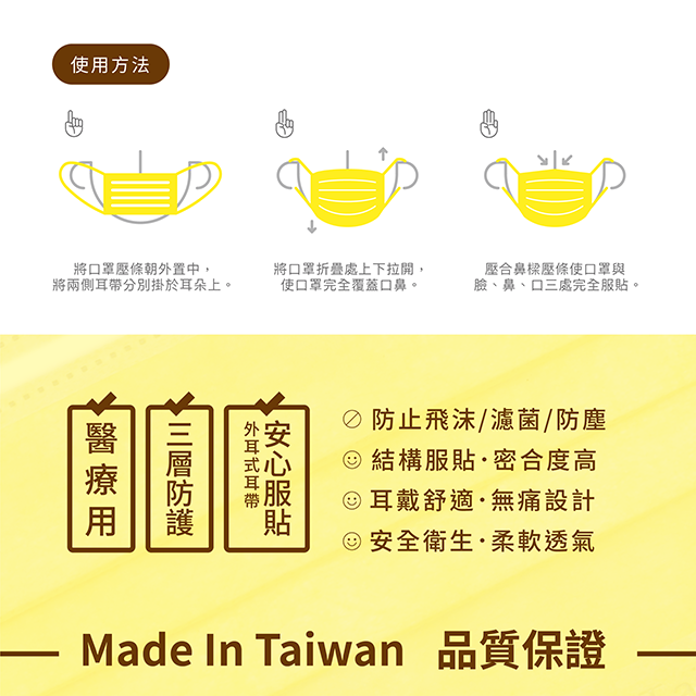 ① 本產品為拋棄式口罩,請勿洗滌或多次使用。