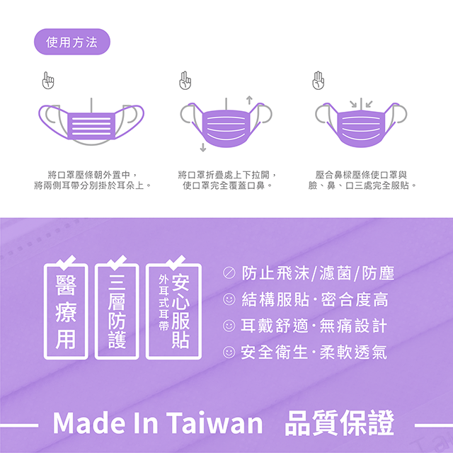 ① 本產品為拋棄式口罩,請勿洗滌或多次使用。