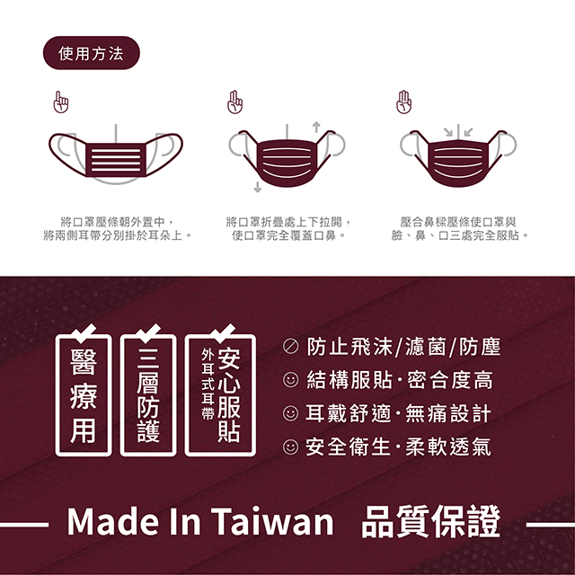 ① 本產品為拋棄式口罩,請勿洗滌或多次使用。
