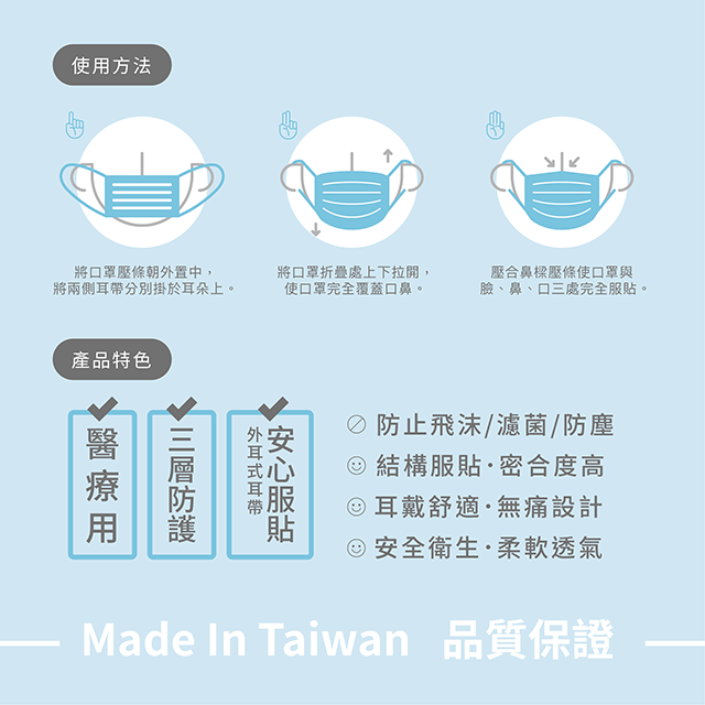 ① 本產品為拋棄式口罩,請勿洗滌或多次使用。