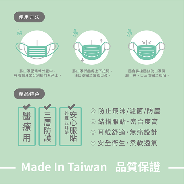 ① 本產品為拋棄式口罩,請勿洗滌或多次使用。